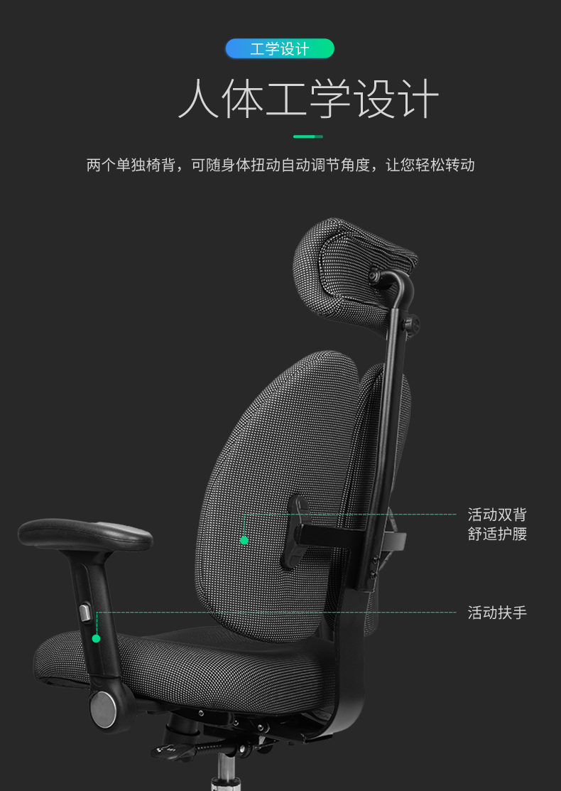 成人双背椅拥有多项调节机构,包括:升降、多段位同步倾仰、座位前后调节、靠背高低调节,头枕多段位调节、扶手升降和角度调节,还有透气。成人双背椅的故障率很低,零部件都是采用了最好的材料,有效缓解长期坐在电脑前的疲劳,纠正坐姿。